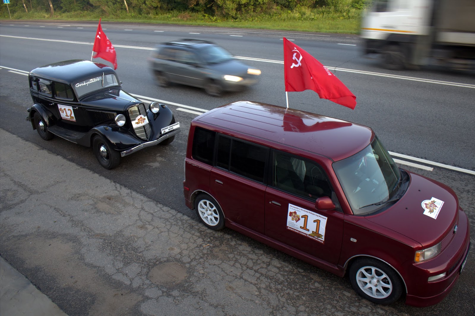 Возглавляли колонну два автомобиля времён Великой Отечественной Войны – легендарная Эмка (ГАЗ-М) и командирский ГАЗ 67Б из коллекции Военно-технического музея в Черноголовке.